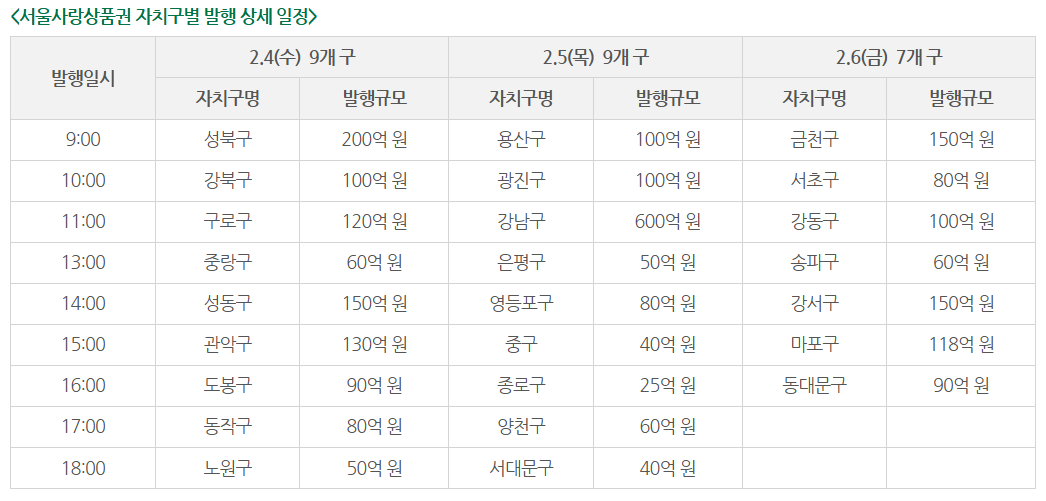 자치구별 서울사랑상품권은 접속 인원 분산을 위해 2월 4일(수)부터 6일(금)까지 사흘간 자치구별로 시간을 나누어 발행될 예정입니다.
